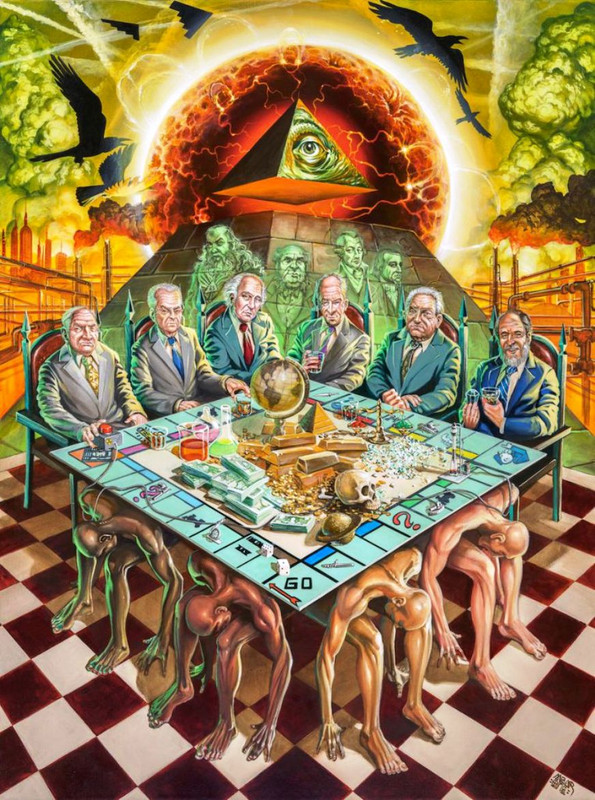 So the six men playing Monopoly — there are no female Freemasons — are not Jews. They are Freemasons. The mural isn’t anti-Semitic at all. It’s a satirical comment on the Freemasons.